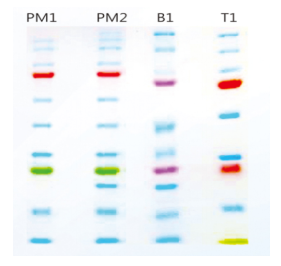 BioSciTM ColorBandTM Prestained Protein Marker產品應用于SDS-PAGE凝膠電泳時,可實時監測蛋白樣品的分離情況,也可以用于評估Western轉膜(PVDF、尼龍或硝酸纖維素膜)效率,并粗略的估計蛋白樣品的分子量。