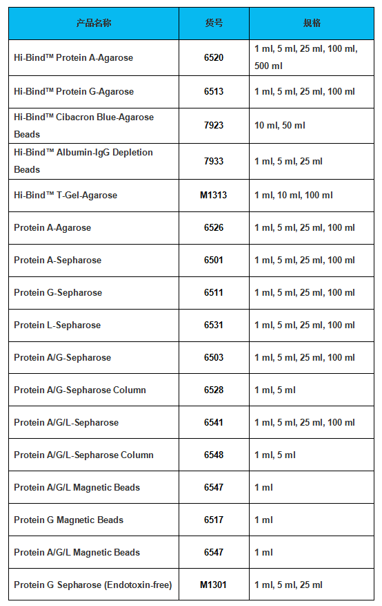 BioVision公司生產的 Hi-BindTM T-Gel Agarose beads 是T-gel 瓊脂糖凝膠法,具有很高的蛋白結合能力,可達30mg蛋白/ml beads。同時,可兼容多種樣本,任何類型的免疫球蛋白都可純化,如來自血清、腹水、組織或細胞培養液等樣本中的IgG, IgE, IgM, IgA, IgY 和Fab 片段等。
