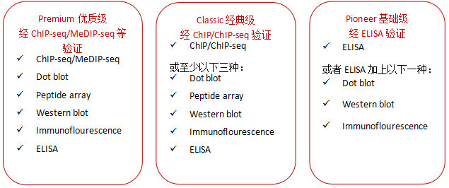自2004年以來(lái),Diagenode就與領(lǐng)先的表觀遺傳學(xué)專家和表觀遺傳學(xué)聯(lián)盟合作生產(chǎn)、驗(yàn)證包括抗體在內(nèi)的表觀遺傳學(xué)試劑。2012年,Diagenode用一種創(chuàng)新、嚴(yán)謹(jǐn)?shù)目贵w分類系統(tǒng)改革了免疫沉淀技術(shù),用于表觀遺傳學(xué)研究。根據(jù)驗(yàn)證水平將抗體分為三個(gè)不同級(jí)別,以幫助您建立選擇抗體的信心。最終,用您信任的抗體獲得滿意的結(jié)果。