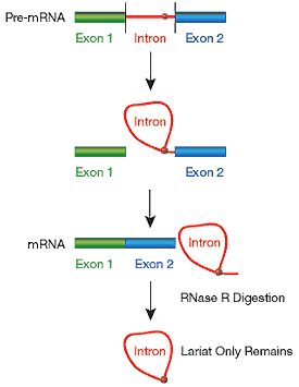 隨著環狀RNA的深入研究,環狀RNA制備問題就越來越備受關注。Lucigen提供大腸桿菌來源的RNase R,是一種Mg依賴性的3’ →5’核糖核酸外切酶,能消化基本上所有線性RNA,但不消化套索或環狀RNA的結構,或者3’突出短于7個核苷酸的雙鏈RNA。即是除了tRNA,5S RNA和內含子套索結構外,大多數細胞RNA都將被RNase R完全消化。如圖4,RNase R可從總RNA中分離出內含子前體mRNA剪切產生的套索RNA。以這種方法獲得的RNA作為模板來生產標記的cDNA,可作為含有潛在的內含子序列的微陣列的目標,或者用于包含完整的染色體或者基因組的重疊區域平鋪陣列。產生的cDNA不代表線性內含子,但其含有的序列是來源于內含子的。