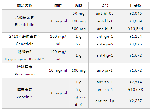 達(dá)科為生物是InvivoGen公司在中國(guó)的一級(jí)代理,并且和InvivoGen一直都有良好的合作,達(dá)科為準(zhǔn)備了大量InvivoGen篩選抗生素現(xiàn)貨,即日起篩選抗生素下列現(xiàn)貨參加6折促銷(xiāo)活動(dòng):