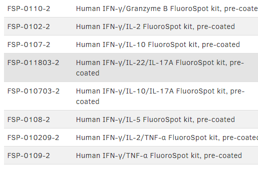 通過分泌單,雙和三色細胞因子分析劃分功能性T細胞亞群在許多不同的研究領域均引起極大的興趣。FluoroSpot可用于疫苗開發,主要用于檢測和分析疫苗特異性免疫應答。在癌癥研究中,FluoroSpot可用于,例如監測腫瘤浸潤淋巴細胞或通過同時分析IFN-γ和顆粒酶B的分泌,以提供細胞毒性T細胞反應更直接的評估。Mabtech公司提供了各種不同的熒光斑點試劑盒用于單,雙和三色分析物的T細胞的分析,其中IFN-γ可單獨分析或與幾個不同的分析物同時進行分析。