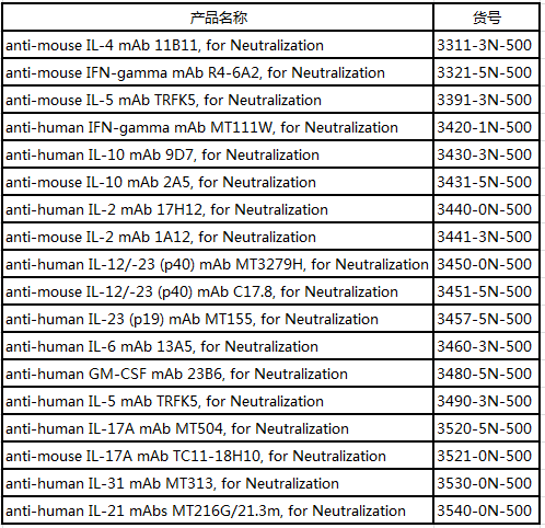 Mabtech除了ELISpot、ELISA相關檢測產(chǎn)品外,還提供人、小鼠等多種指標的中和抗體;并且Mabtech的中和抗體均為單克隆抗體,不含疊氮化鈉,且內(nèi)毒素含量均低于10 EU/mg。