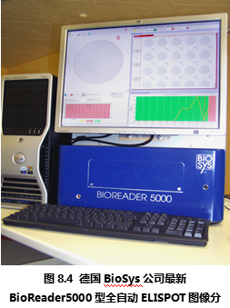 德國Bio-Sys公司從上世紀80年代開始就致力于生物圖像識別領域,在進入ELISPOT圖像分析儀市場后一直以其先進的ELISPOT斑點識別技術(shù)聞名。德國Bio-Sys公司首先解決了顯微攝像系統(tǒng)難以定位96孔板上的每一個孔的問題。其解決方法基于圖像識別技術(shù),利用板孔邊壁和真正的孔底的細微差別,在機械定位的基礎上,通過軟件識別來進一步提高每孔的定位精度。是目前市場上所有ELISPOT圖像分析儀中唯一能夠完整識別整個孔底ELISPOT斑點圖像的設備。在對真假斑點的分辨中,德國Bio-Sys公司除了具備完善的物理學多參數(shù)識別技術(shù),還特別針對ELISPOT斑點形成的生物學過程,通過細胞因子顯色后的“光密度”峰值積分分析方法,精確分辨真假斑點、融合斑點等復雜情況。Bioreader系列ELISPOT圖像分析儀國外大多數(shù)較有經(jīng)驗的ELISPOT實驗室推崇的特點為:專業(yè)性和參數(shù)全開放性。因為ELISPOT實驗的復雜性,ELISPOT斑點形成在不同的實驗條件下有非常大的差異。這就對ELISPOT圖像分析儀提出了較高的要求:既要能夠保證斑點計數(shù)的真實性和一致性,又要能夠根據(jù)不同情況,通過實驗者的判斷來校正儀器對ELISPOT斑點識別的標準。要同時實現(xiàn)以上兩個要求,唯一的辦法是將儀器的所有判斷標準向ELISPOT實驗者開放,實現(xiàn)實驗者和儀器的互動。在這一方面,德國Bio-Sys公司始終走在ELISPOT斑點識別領域的前列,新的Bioreader-4000型(圖8.3)和Bioreader -5000(圖8.4) 型在專業(yè)性和適用性方面都領先于其他廠家的設備。