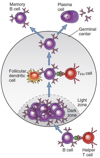 Tfh 細胞的主要作用是增加高親和力 B 細胞和長壽漿細胞的形成,并幫助他們轉移到發(fā)生中心(GC)。在接受抗原刺激后,初始 B 細胞首次移動到 T 細胞區(qū),且在來自 Tfh 細胞和抗原呈遞細胞的共刺激作用下開始活化并形成發(fā)生中心。當發(fā)生中心的 B 細胞開始分化為漿細胞或記憶 B 細胞時, Bcl-6 會阻止 B 細胞的增殖,因為 Bcl-6 可以抑制 B 細胞活化基因的表達,如 CD69、 STAT1 和 CD80 等,同時也會通過調(diào)節(jié) Prdm1 來抑制發(fā)生中心的 B 細胞向漿細胞分化。 Tfh 細胞通過 CD40 的作用致使 Bcl-6 轉錄沉默,從而促使發(fā)生中心 B 細胞存活和增殖。且在這一過程中,CD40L、PD-1、BAFF、IL-4 和 IL-21 等信號分子的參與也是必不可缺的。