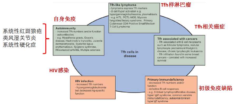 因此,基于 Tfh 細胞的功能特性,其與多種疾病密切相關。 Tfh 細胞及相關分子的缺陷會導致正常的 B 細胞反應不能完成,產(chǎn)生體液免疫缺陷。相反, Tfh 功能亢進也會導致病態(tài)的自身免疫反應,介導自身免疫病的發(fā)生。目前對 Tfh 的研究也主要集中在其與自身免疫疾病和 HIV 的關系上面。